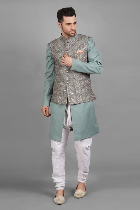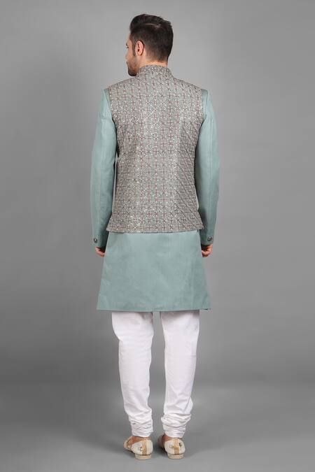 Pistachio green bundi featuring floral embroidered motifs and a welt pocket in front. Paired with a solid mandarin collar kurta and off-white pants.