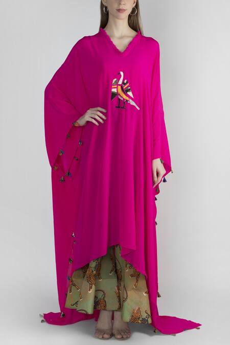 Pink kaftan style kurta with placement bird motif applique work. Comes with mint green animal printed sharara.