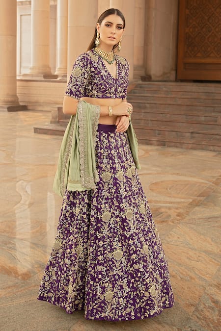 Purple lehenga with all over floral zardozi embroidery. Comes with matching crop blouse and green dupatta.