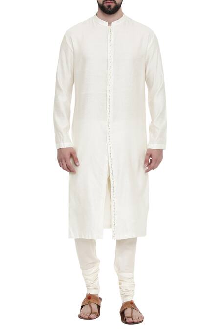 Cream kurta with overall texture & minimal placket embroidery detail. Comes with white churidar.