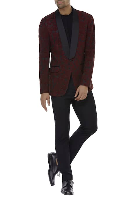 Dual hued black & maroon floral motif tuxedo paired with trousers.