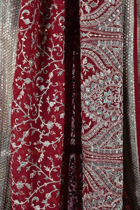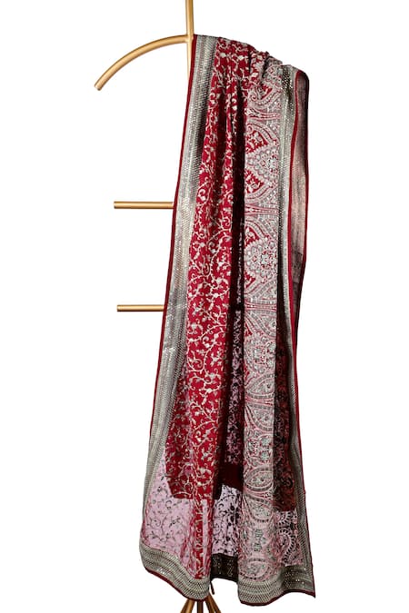 Maroon silk shawl with thread and sequin embroidery in a floral pattern.