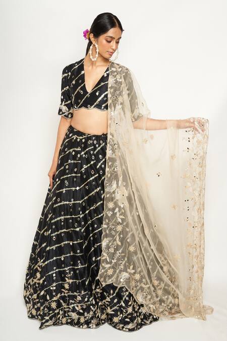 Black bandhani leheriya lehenga in silk base with floral motif. Paired with scalloped hem choli & stone organza embroidered dupatta.