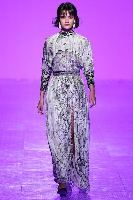 Grey marble printed maxi dress embellished with sequin work & 3D zardozi embroidery.