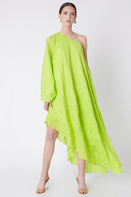 Green silk one shoulder dress with crinkle finish & flared asymmetric hem.
