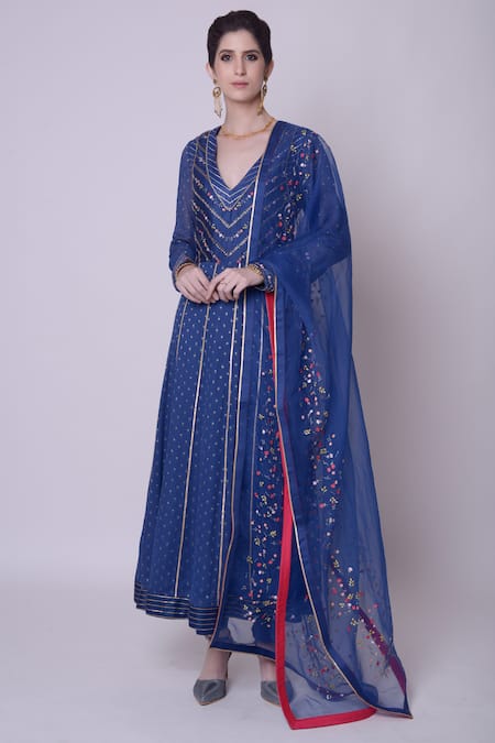 Blue anarkali with embroidered floral detail on yoke. Paired with pants & dupatta.