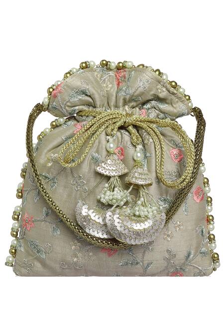 Grey potli bag with floral embroidered motifs & bead detailed border.