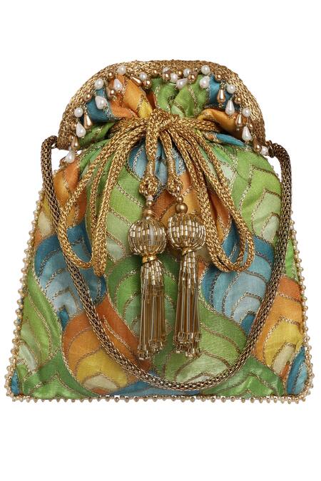 Multi color potli bag with thread embroidered outline & bead detailed border.