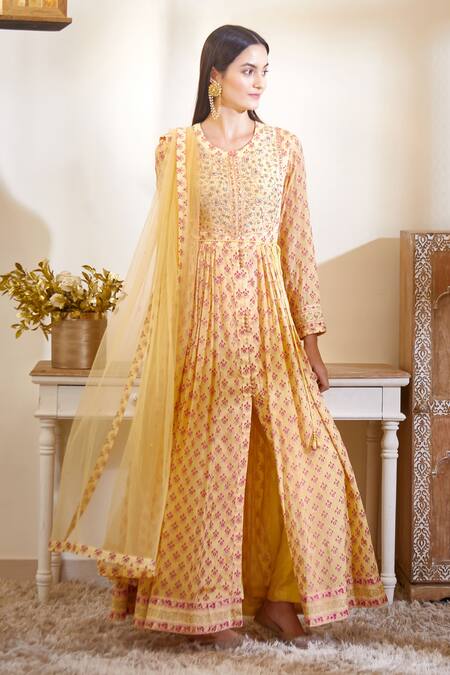Light yellow anarkali with all over block print floral motifs & placement zardosi work. Comes with pants & dupatta.
