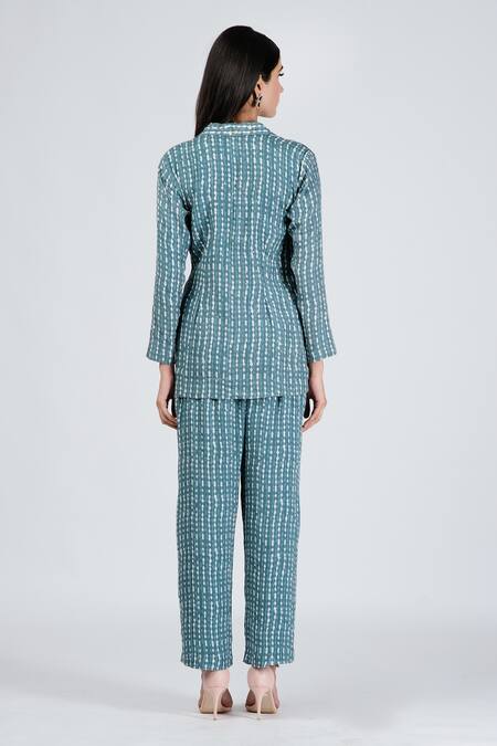 Blue Silk Sequin And Thread, Stripe Print Lapel Collar Shirt & Pant Set