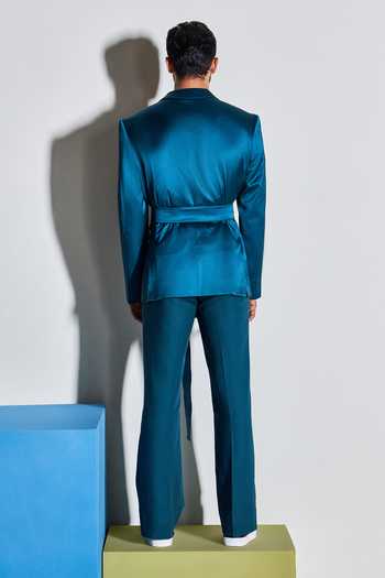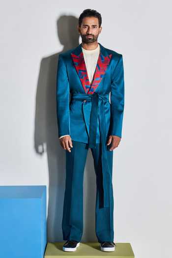 Teal silk satin double breasted jacket with printed contrast lapel collar and tie up at the waist.