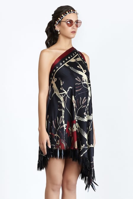 Black dress with all over print & skein embellished hemline.