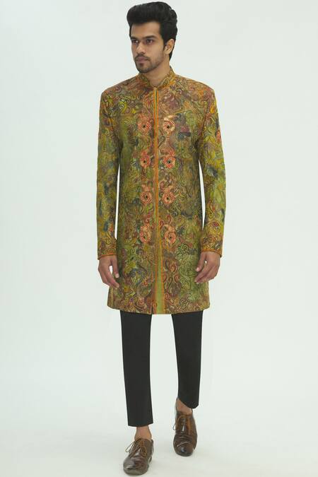 Green sherwani with hand painted & embroidered motifs all over. Paired with pants.