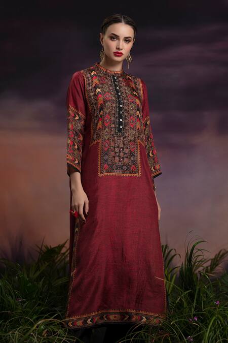 Vermillion panelled tunic with geometric printed motifs, front button placket & mirror work embroidered detail.