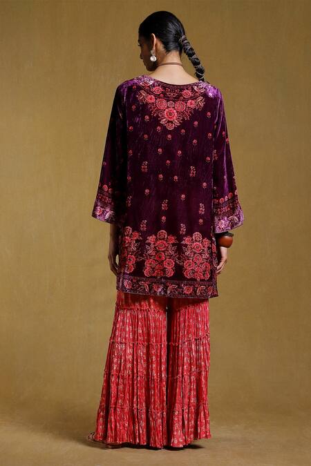 Purple kurta with floral print & round neckline. Paired with crinkled sharara & tassel dupatta.
