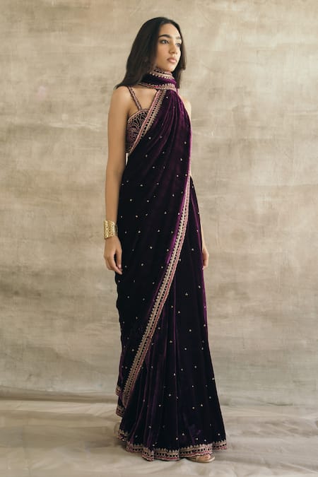 Plum silk velvet saree with thread, sequin and bead embroidery on the border. Comes with strappy blouse.