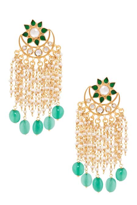 Exquisitely crafted in gold plated silver with vibrant green quartz stones, this pair of dangler earrings features crystal and pearl embellishments.