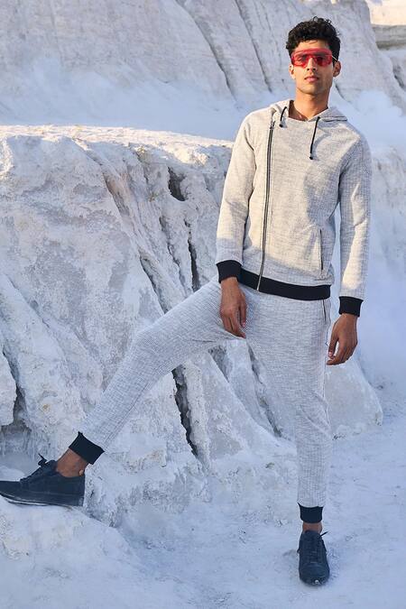 Grey zip-front hoodie featuring a textured base, drawstring detail at the neckline, and full sleeves. Paired with coordinating joggers that have zip details at the pockets and contrast ribbed cuffs and waistband.