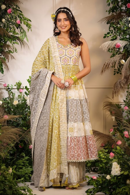 Multi-colored mulmul kurta with khari print and gota embroidery. Comes with sharara and a dupatta.