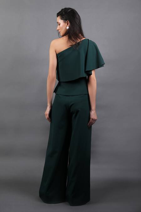 Forest green jumpsuit featuring a one-shoulder neckline and flared sleeves