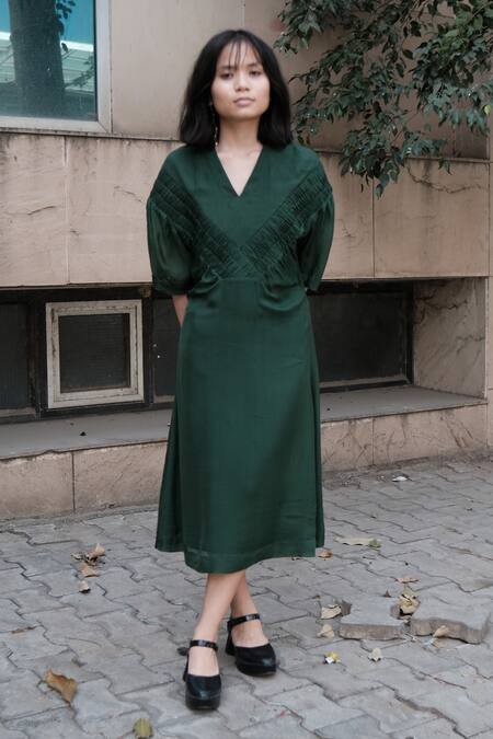 Green 100% Cupro Lining - 100% Viscose V Neck Sheer Back Dress