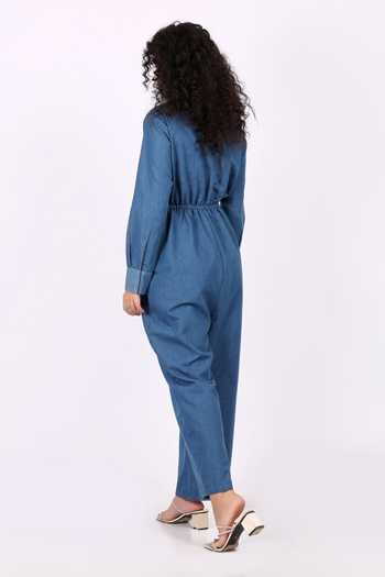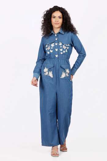 Blue denim jumpsuit with butterfly applique and dori kadai work.