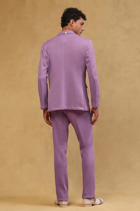 Lavender full sleeve jacket featuring a notched lapel collar and patch pockets. Paired with matching pants for a complete look.