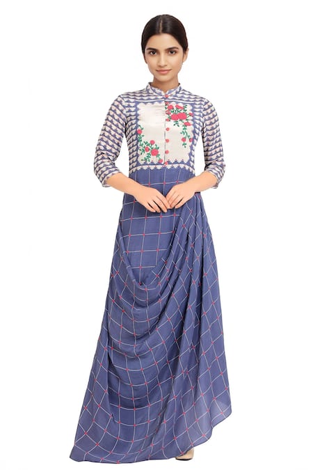 This ethnic themed maxi dress features a cowl drape layer at the base and a fitted bodice that is accentuated by floral motifs at the yoke. No of components: 1 Front loop buttons Mandarin collar Three quarter sleeves