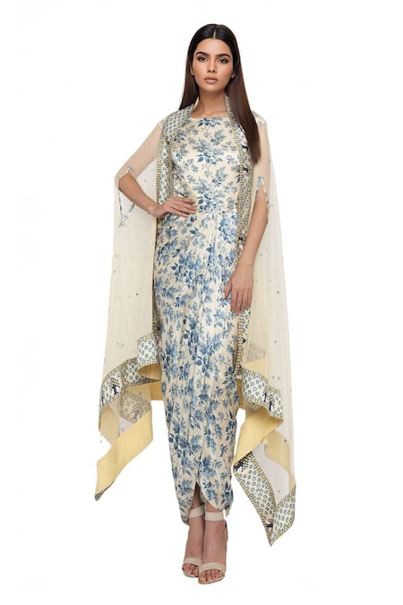 Off white satin draped dress with floral printed motifs & sequin embroidery. Paired with net embroidered cape.
