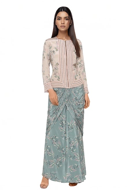 Pink jacket-style top with all-over floral printed motifs & sequin embellished accents. Comes with a blue printed draped skirt.