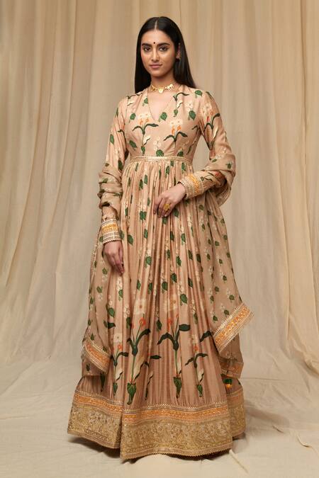 Oatmeal chanderi V neck anarkali with spring blossom & cotton candy placement print, gathered at the waist, scalloped neckline along with centre back opening and embroidered borders. Comes with cotton candy organza dupatta embellished with embroidered borders and edged with tassels. Paired with beige leggings.