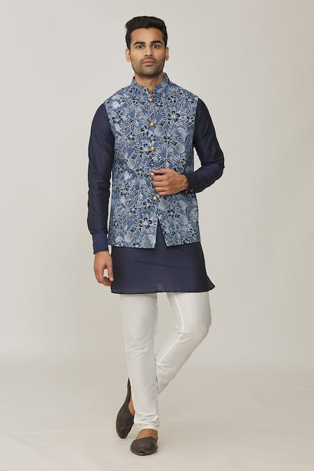 Navy blue bundi featuring a pineapple print and mandarin collar. Paired with a full sleeve kurta and white churidar.