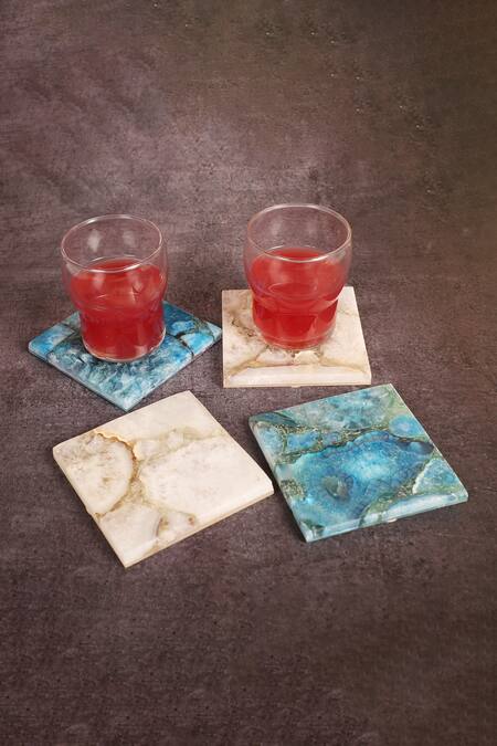 Square shaped, Dimensions (in inches): 4 x 4 x 0.25, Weight (in kgs): 1.5, Volumetric weight (in kgs): 2, Note:, Made from natural agates; hence the colour and texture may vary as these are natural stones, Note: Only selling 1 each of white, blue, pink & purple coasters