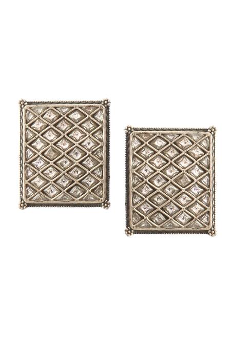 92.5 sterling silver stud earrings in square design with white kundan jadau embellishment.