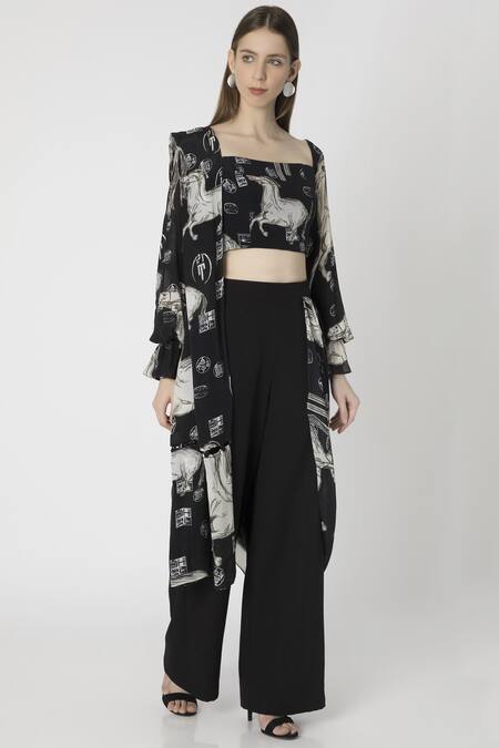 Buy_Masaba_Black Crepe Stallion Print Pant Saree_Online_at_Aza_Fashions