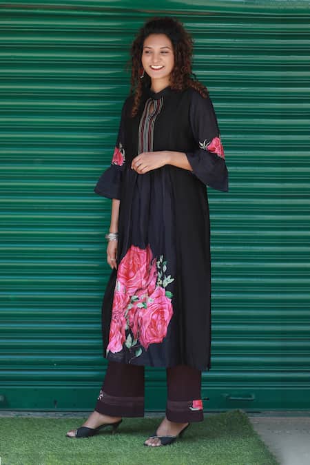 Buy_Tina Eapen Collective_Black Chanderi Silk Print Rose Bloom Stand Collar Kurta With Pant_Online_at_Aza_Fashions