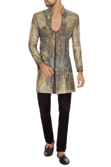 Become the centre of attraction as you wear this steel grey bengal silk sherwani. It features hand embroidery with different shades of zari work that lend it a stunning look. The bengal silk make ensures a charming appearance. It comes along with black churidar.