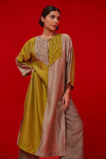 Green and grey tunic in Mysore Silk with an opal embroidered yoke and a relaxed silhouette.