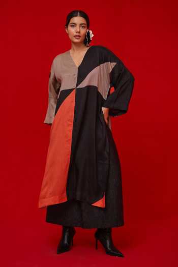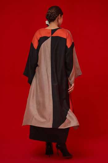 Black kurta with colorblock panels and a relaxed long silhouette. Crafted in Mysore Silk with a V-neck and full sleeves.