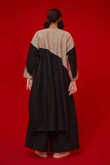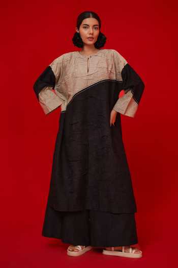 Black tunic kurta in crushed silk fabric, featuring a textured surface and diagonal colour-block design. Paired with matching wide-leg pants.
