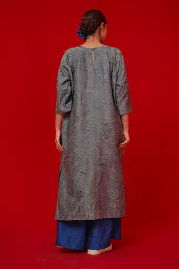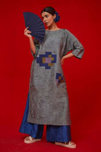 Grey crushed silk kurta featuring geometric patchwork and embroidered detailing. Paired with a blue palazzo.