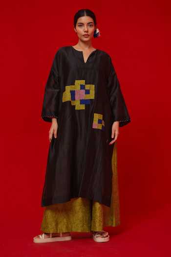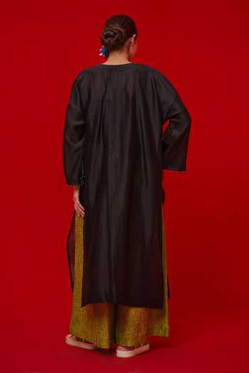 Black Silk, Chanderi Embroidery Split V-neck Trace Tunic