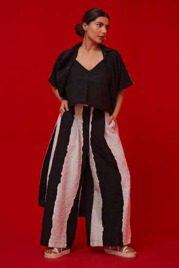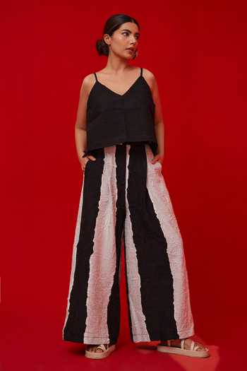 Vertical colour-block panels, Crushed-silk texture, Box pleats for structure