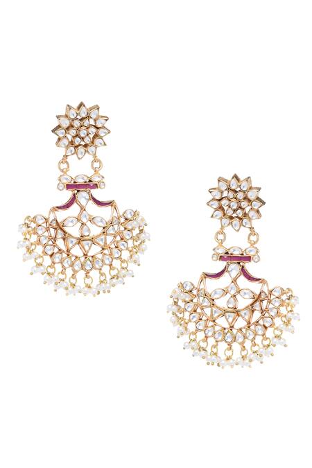 Gold chandbalis featuring intricate crescent carving adorned with polki stones and enamel details