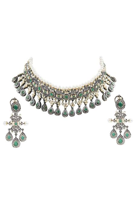 Victorian finish silver hued choker studded with beads, crystals and green stones. Matching earrings complete the set.