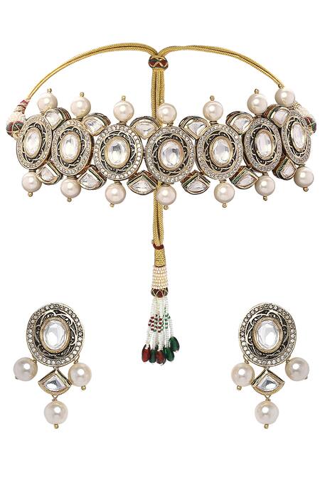 Gold toned choker with embellished stones & Meenakari work. Comes with stud earrings.