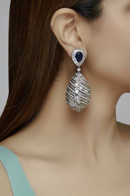 Silver plated long earrings with sapphire stone head & geometric cutwork.