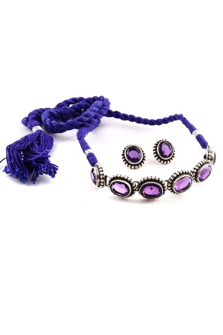 Silver toned handmade choker featuring blue gemstones and rawa work