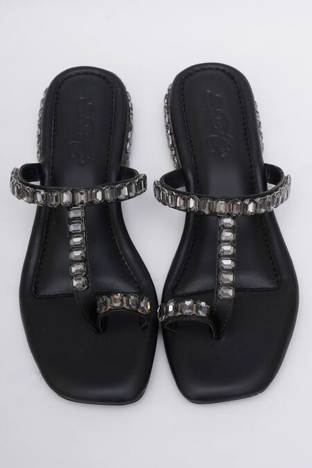 Black kolhapuri heels featuring stone embellishments and a toe ring