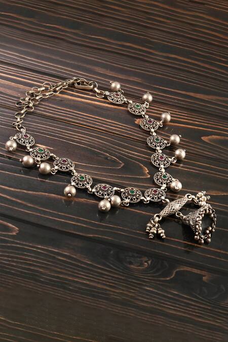Floral design with gemstone embellishments, Intricate silver detailing, Hanging bell accents